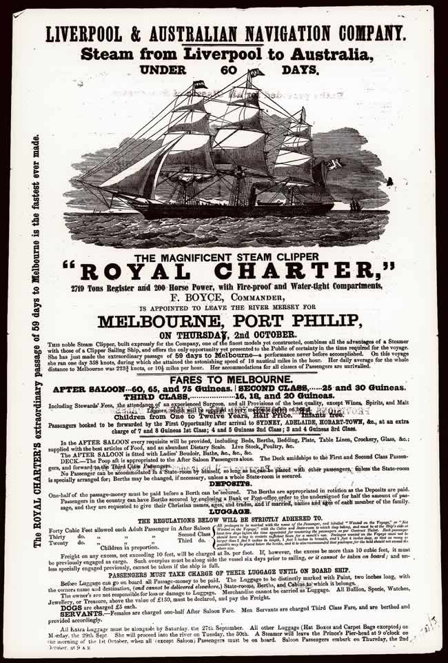 John Keith or the mention of "Morrison from Bloomfield" is mentioned almost 40 times throughout the book. Bloomfield being the town of Skowhegan in 1853. Their research found John Keith on the ship "Rockland" which sailed from New York to Melbourne on a four month voyage. The ship made an unscheduled stop in Rio de Janeiro to take care of some mutineers. His cabin roommates were the Allen boys and Reed from Madison. Below is an advertisement for a similar voyage from Liverpool.