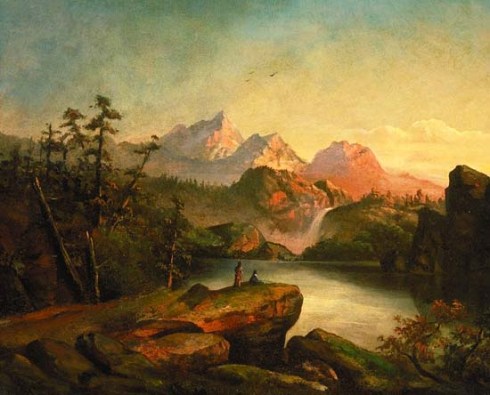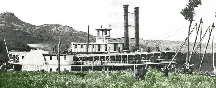The steamboat is the Desmet, one that was captained by Joseph Labarge. Originally a black and white picture, the foreground was colored in green. The third picture is an antique print that shows the Minarets, a famous landmark along the Missouri. Both the Missouri and the Yellowstone Rivers have their source in Yellowstone Park in the Northwestern corner of Wyoming.