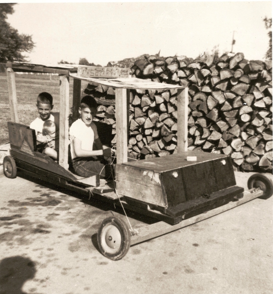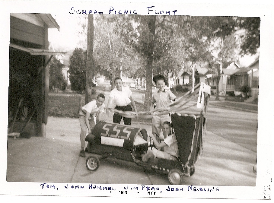 It did have a motor, which I was cranking up in the photo. The guy standing next to me, John Hummel (his father was owner of Hummels Market in the neighborhood), was very handy and he rigged a lawn mower motor so it would work on the go-cart. The problem was it vibrated the go-cart so much that the whole thing was falling apart by the end of the parade. But the 8th grade girls all felt sorry for us and gave us lots of sympathy, which we accepted.