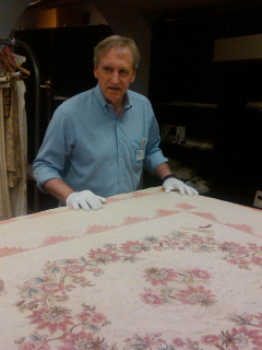 in the summer of 2010, Tom and Jim Morrison visited the DAR musuem where they were met by Alden O'Brien. She graciously brought out William's quilt from their most protected storage. In fact, the box that the quilts are stored in are labeled with instructions to save them first in case of fire. The other historical textile mentioned along with Amelia's quilts are Thomas Jefferson's socks!