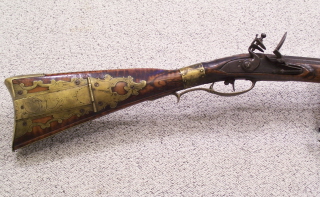 Simon was an excellent carver but never executed in high relief. This design is not too distant from Lebanon but is seen on a rifle by John Haymaker dating to 1785. Rocco styling is evident in the venated wavy line surrounding the C scrolls. This rocaille motif, found on furniture, silver, and other decorative arts in Europe and America, is based on the naturalistic appearance of the edge of a shell. One of Simon’s rifles was exhibited/published by Morrison Hecksher and Leslie Greene Bowman in “American Rocco, 1750-1775”.