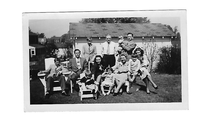 From left to right. First row: Gene (son), Pierre II (son), Tom Morrison (grandson), Dorothy Morrison (daughter), Susan Balducci (granddaughter), Elsie, Don Balducci (grandson), Virginia Balducci (Ginny - daughter).