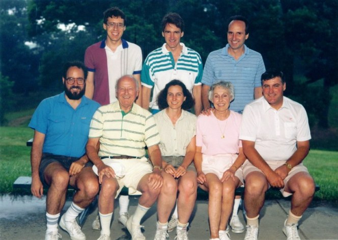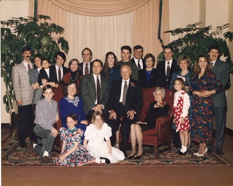 The Morrison family at Keith and Dorothy's 50th wedding anniversary in 1993. From the left back row: Jack and Patti Wilkes with son Alex, son Kevin with Mary and Tom, skip Dave, daughter Jill son Curt with Denny and Terry, Jim and Veronica with daughter Lydia, Kathy and Bill. Front row from left: Doctor Ben with Peggy and Dave with daughters Annie and Margie, Keith and Dorothy. Everyone simply gorgeous!