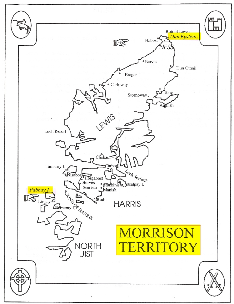 The Morrisons of Pabbay have been traced to living descendants of this day, of which Dr. Iain Morrison has been appointed Chief of the Clan in 1965.The Morrisons of Lewis met their fate around 1616 when their leaders were slain by the rival clan the Macleods. See the following for a legendary rendition of this event.