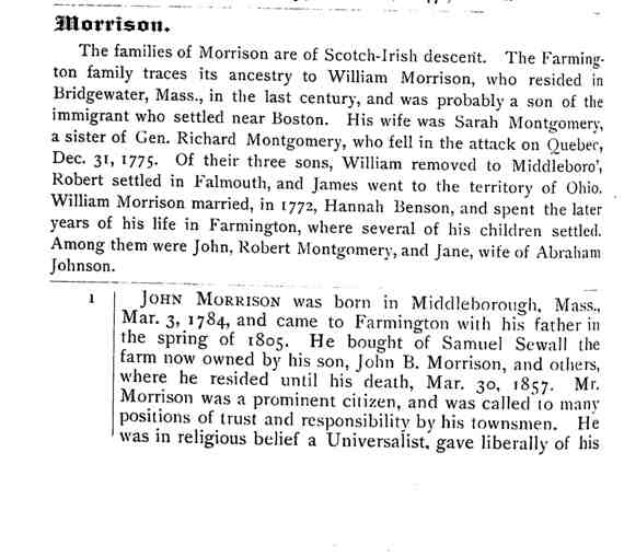 This was one of the first clues we had of Robert Morrison, before the Strowbridge book was found. On pages 534-536 it relates the history of the Morrisons in New England. This history did not go back further than William, who married Sarah Montgomery. This history is incorrect in that Sarah was not a sister of General Richard Montgomery, who fell in the attack on Quebec in 1775.
