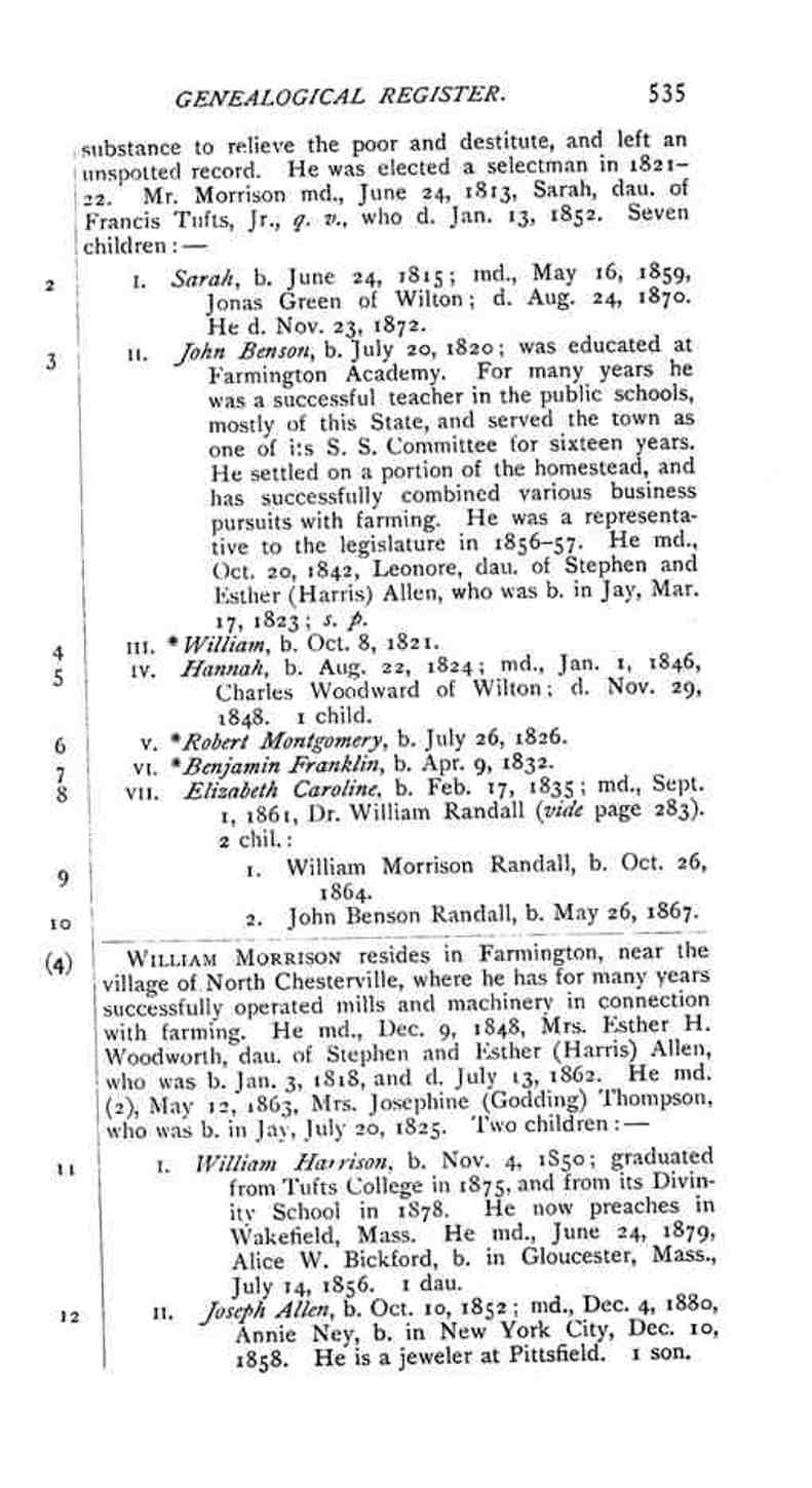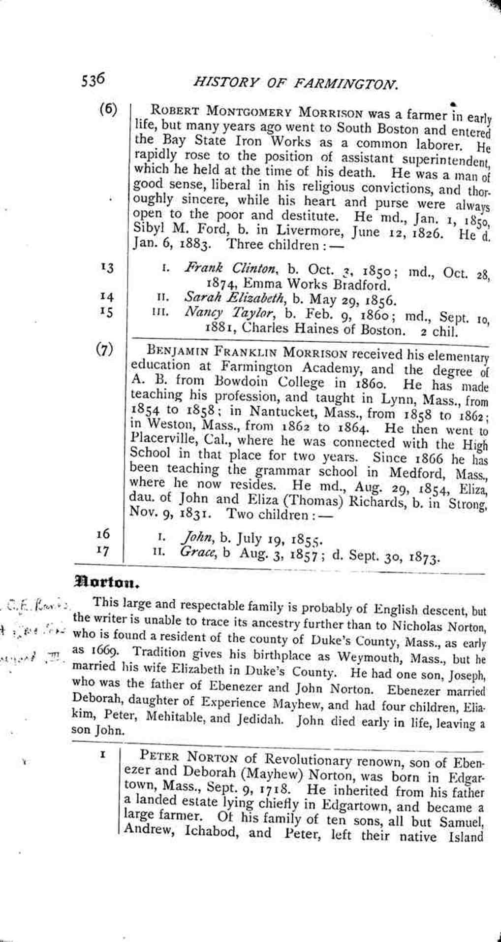 This is a large work of the biographies of the numerous families of New England. On page 109, the Morrison family is discussed. It is pretty much a repeat of the previous histories of the family from Robert Morrison plus two generations. Birth and death dates are given.
